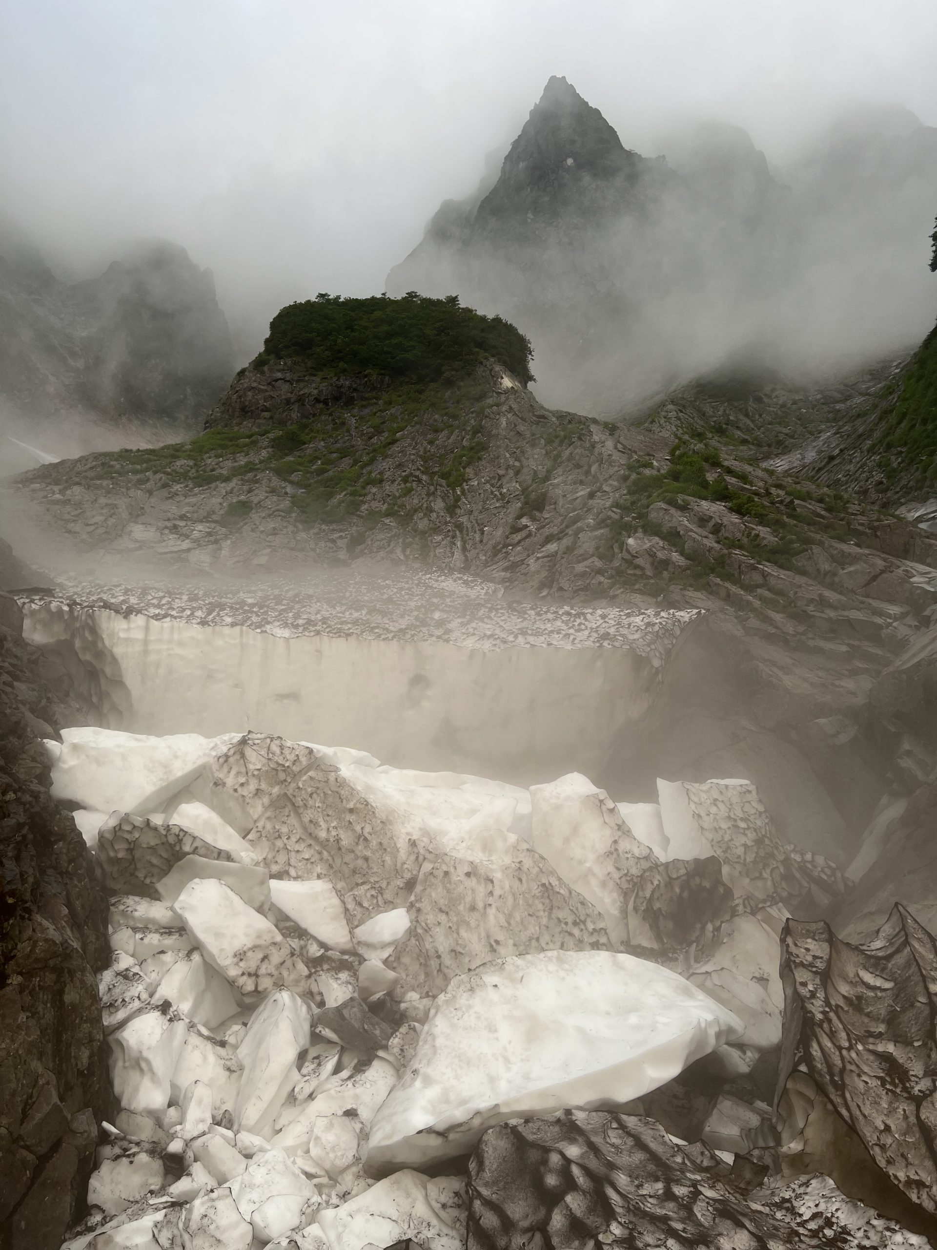22日〜24日はチンネ左稜線の予定だったが、土合山の家泊で一ノ倉沢中央稜に変更。この変更は僕のミス。19日に判断したのが失敗だった。20日まで判断を延ばしていたら行けたはず。このように不安定な時期は直前に判断しないとダメだ。人生初の真夏の一ノ倉沢はやはり灼熱だった。判断ミスを痛感しながら衝立の頭まで登った。こんな判断ミスは二度としませんお許しください。